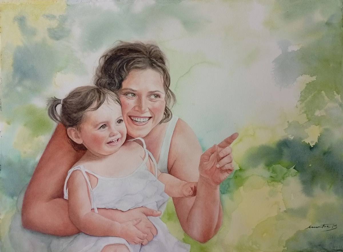 “La pintura em serveix d’eina per plasmar l’expressió, que és el que em motiva”, apunta l’artista, que treballa “amb paper 100% cotó”, l’aigua, els pigments, “jugant amb mullat sobre mullat, sec sobre sec”, superposant capes, treballant la tècnica de l’aquarel·la per mostrar aquest nen amb auriculars, aquesta dona pensativa, aquests dos nens en celebració feliç d’aniversari.