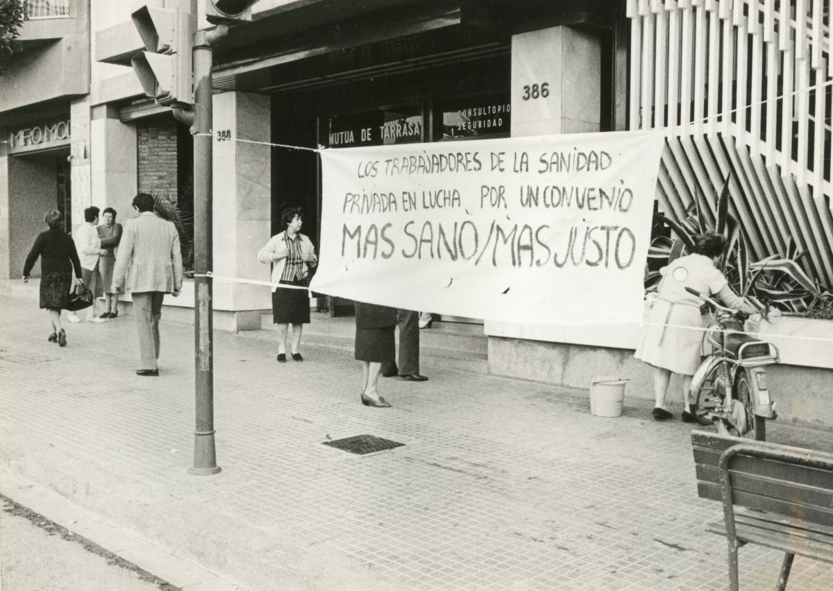 La principal diferència entre la reivindicació que surt avui i la que es veia ahir en aquesta secció és l’absència de persones manifestant-se. Les uneix que són imatges de la mateixa jornada, amb una protesta del personal del sector sanitari demanant un conveni “més sa, més just”. Una pancarta en solitari davant d’un centre sanitari també té el seu efecte perquè, si més no, hi haurà molta gent passant per la zona i, molta d’aquesta gent, segur que se la llegirà. Si les persones lectores estigui d’acord o no amb les demandes, ja són figues d’un altre paner. S’ha de dir que les persones que surten a la instantània estan d’esquena a la pancarta i al seu missatge.