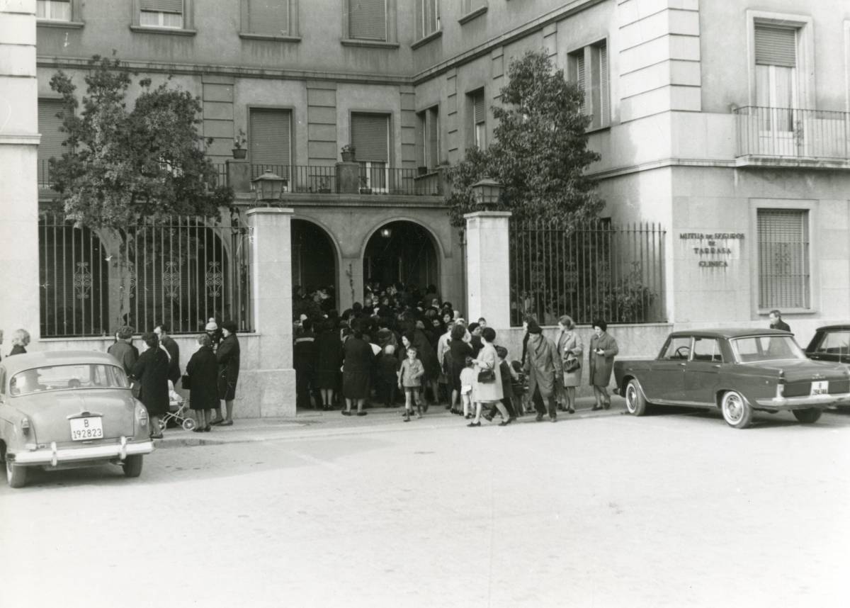 Què fa aquesta multitud de gent a les portes de l’edifici que sempre s’ha anomenat com a Maternitat? A la dreta es llegeix, clarament, “Mutua de Seguros de Tarrasa” i, a sota, un concís “Clínica”. Hi ha una quantitat important de persones a l’entrada que, com es comprova mirant la instantània més actual, no té res a veure. I, pel que es dedueix, la majoria són dones, acompanyades per infants i, fins i tot, nadons. Tenint en compte que era la Maternitat, tampoc ha d’estranyar, però estaria bé que, apel·lant a la màgia d’aquesta secció, “Ahir i Avui”, algú pogués revelar alguns dels secrets que amaga aquesta fotografia del passat.