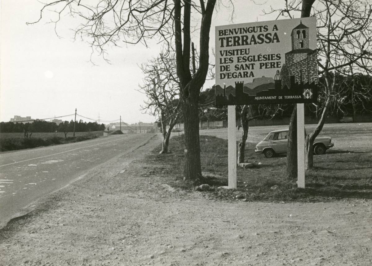 El cartell que anuncia que els vehicles o els caminants que s’acosten a la zona és una joia de valor indefinible. “Benvinguts a Terrassa”, encapçala el missatge, seguit d’un suggeriment: “Visiteu les Esglésies de Sant Pere d’Egara”. Encara no era la Seu d’Ègara, com es pot confirmar.